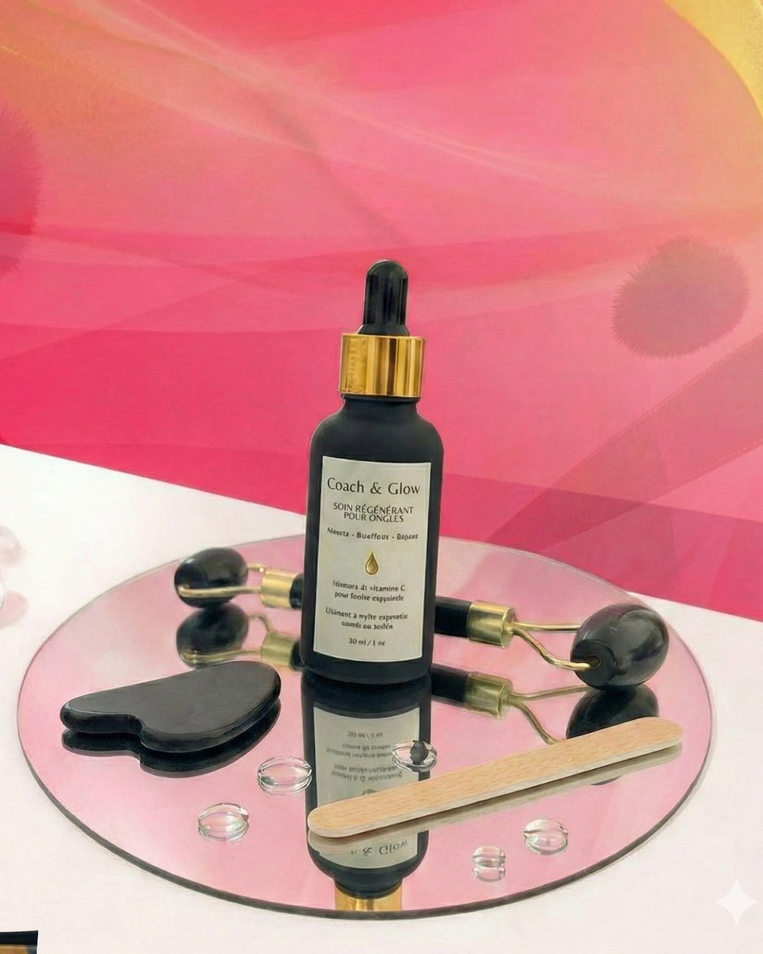 Ce coffret cadeau premium contient notre sérum régénérant pour ongles, formulé avec des actifs nourrissants qui pénètrent en profondeur pour renforcer la kératine. Complétez votre routine avec un Gua Sha en pierre naturelle et un roller visage pour stimuler la circulation sanguine et sublimer votre teint. La lime à ongles professionnelle prépare vos ongles à recevoir le sérum pour une efficacité optimale.